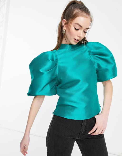 ASOS DESIGN – Hochgeschlossenes Satin-Oberteil in Smaragdgrün mit Puffärmeln