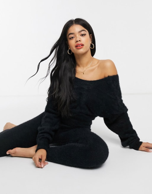 ASOS DESIGN – Hochwertiges Set mit flauschigem Strickpullover mit Wickeldesign hinten und Leggings