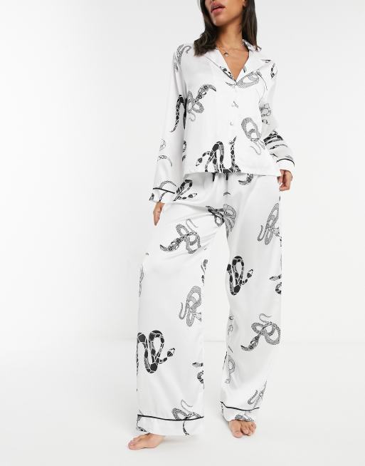ASOS DESIGN – Hochwertiges, weißes Pyjama-Set mit Hemd und Hose aus Satin mit Schlangenmuster