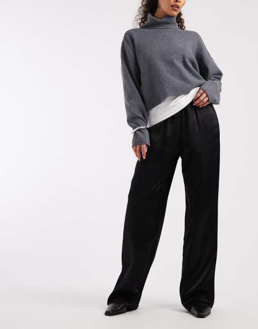 ASOS DESIGN – Hose zum Hineinschlüpfen aus Satin in Schwarz mit weitem Bein
