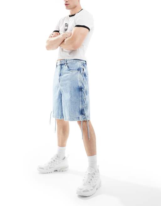ASOS DESIGN – Jeans-Jorts in normaler Länge in hellblauer Waschung mit Schnürdetail