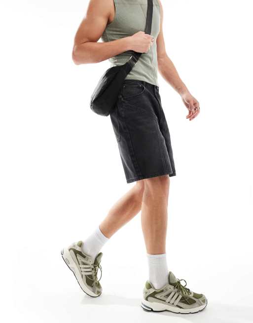 ASOS DESIGN – Jeans-Jorts in Standard-Länge in verwaschenem Schwarz mit Bahnendetails