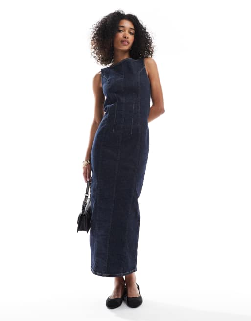 ASOS DESIGN – Jeans-Maxikleid in Indigo mit betonter Taille und Schlitz vorne