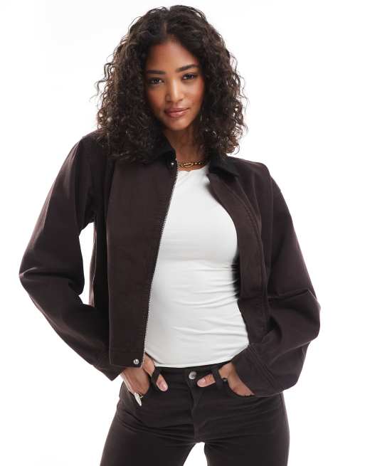 ASOS DESIGN – Jeansjacke in Schokoladenbraun mit Kontrastkragen