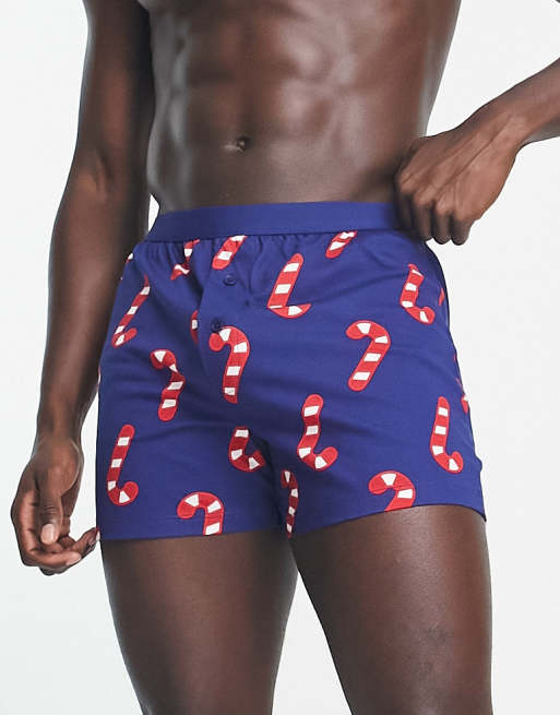 ASOS DESIGN – Jersey-Boxershorts in Marineblau mit weihnachtlichem Zuckerstangen-Muster