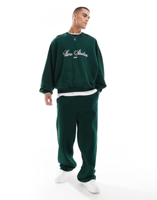 ASOS DESIGN – Jogginghose in Dunkelgrün mit weitem Bein und seitlichem Zierstreifen