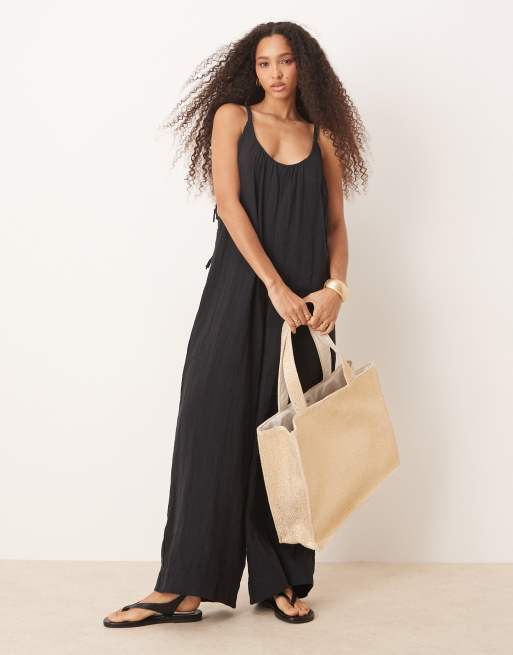 ASOS DESIGN – Jumpsuit aus doppellagigem Stoff in Schwarz mit geflochtenen Schulterträgern und U-Ausschnitt