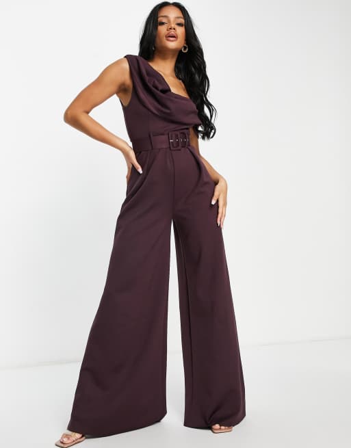 ASOS DESIGN – Jumpsuit aus Scuba-Stoff in Aubergine mit One-Shoulder-Träger, weitem Bein und Gürtel
