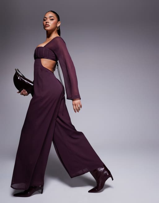ASOS DESIGN – Jumpsuit in Beerenrot mit Korsett-Körbchendetail aus Satin, weitem Bein und Zierausschnitten