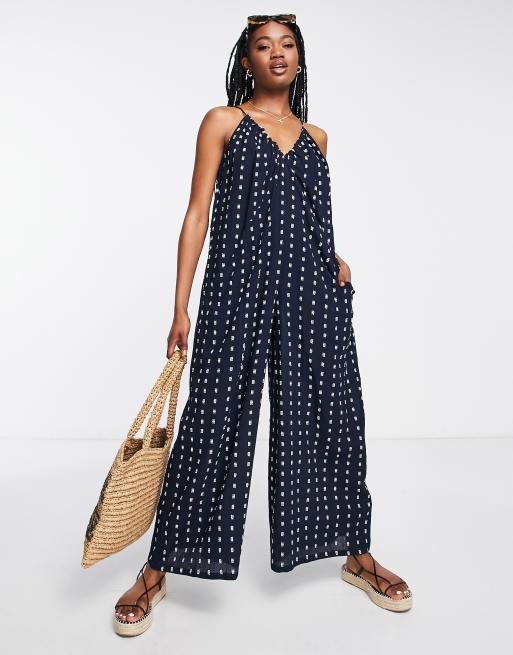 ASOS DESIGN – Jumpsuit mit schmalen Trägern, gerafftem Ausschnitt und strukturiertem Print
