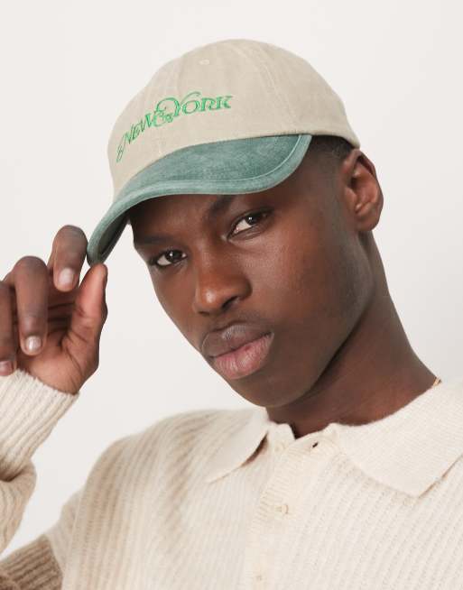 ASOS DESIGN – Kappe in Steinbeige mit New York-Stickerei und kontrastierendem Schirm in Grün
