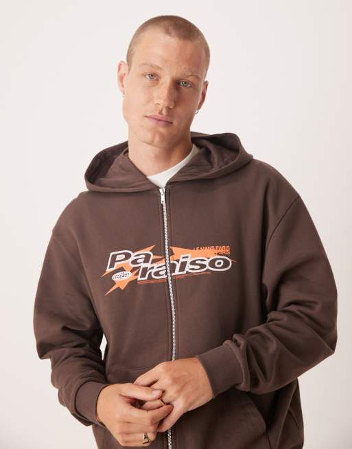 ASOS DESIGN – Kapuzenjacke in Braun mit sportlichem Print und Reißverschluss