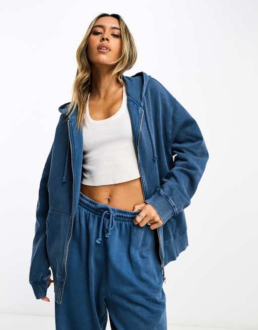 ASOS DESIGN – Kapuzenjacke in verwaschenem Jeansblau mit durchgehendem Reißverschluss, Kombiteil