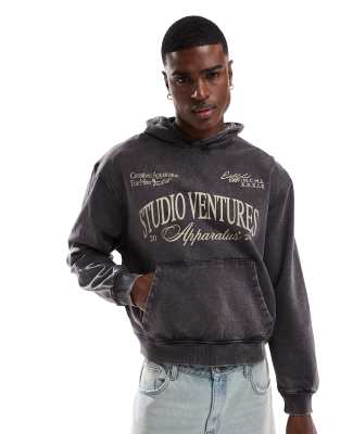 ASOS DESIGN – Kapuzenpullover in Grau mit Acid-Waschung und Print auf der Vorderseite