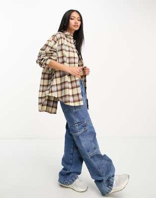 ASOS DESIGN – Karierte Oversize-Hemdjacke in Hellbraun und Blau mit Taschen