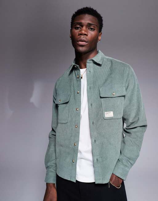 ASOS DESIGN – Kastige Cord-Hemdjacke in Grün mit Aufnäher