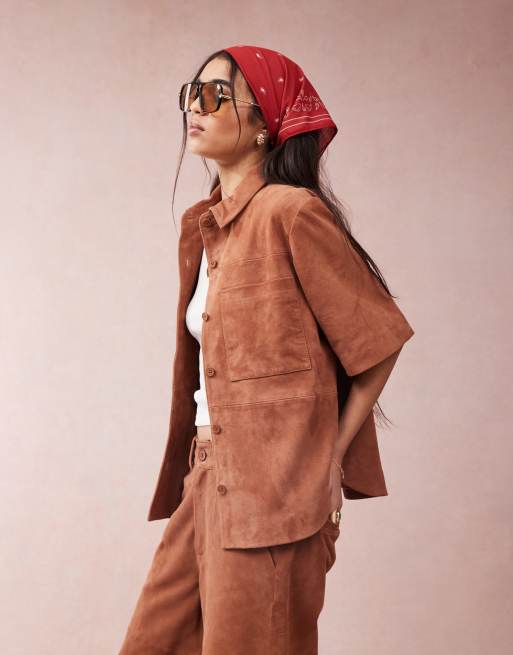 ASOS DESIGN – Kastige Cropped Hemdbluse aus Wildleder in Hellbraun, Kombiteil