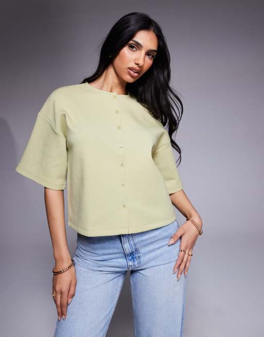 ASOS DESIGN – Kastige Hemdbluse aus Interlock-Stoff in Salbeigrün mit Knopfleiste