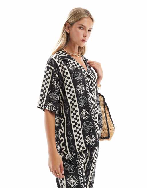 ASOS DESIGN – Kastige Hemdbluse in Schwarz-Weiß mit Muschel-Urlaubsprint, Kombiteil