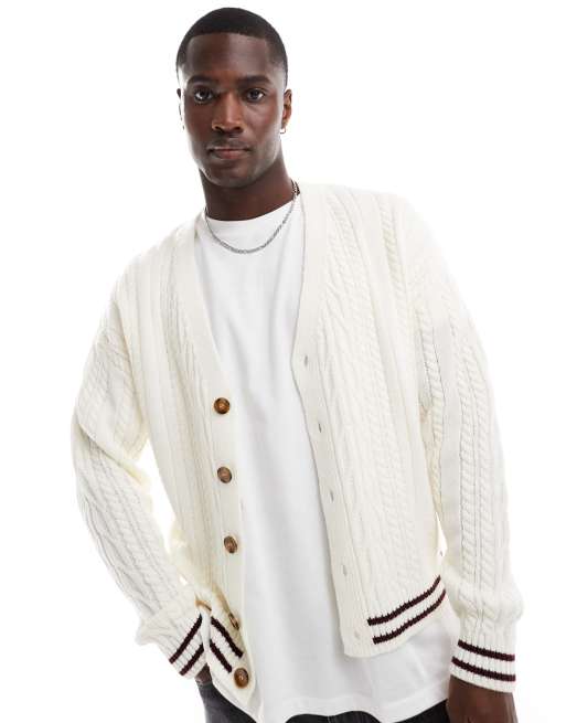 ASOS DESIGN – Kastige, locker geschnittene Strickjacke in Cremeweiß mit Zopfmuster und burgunderroten Zierstreifen