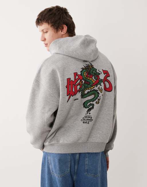 ASOS DESIGN – Kastiger Kapuzenpullover in Grau meliert mit extremer Oversize-Passform und Drachenprint