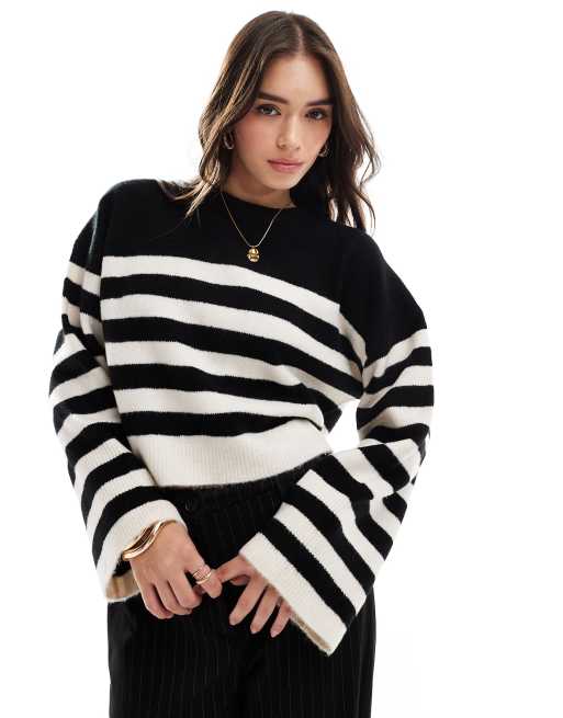 ASOS DESIGN – Kastiger Pullover in Schwarz-Weiß gestreift mit Rundhalsausschnitt und breiten Bündchen