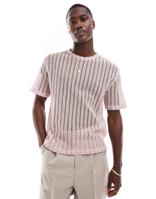 ASOS DESIGN – Kastiges, gehäkeltes T-Shirt in Rosa mit lockerem Schnitt