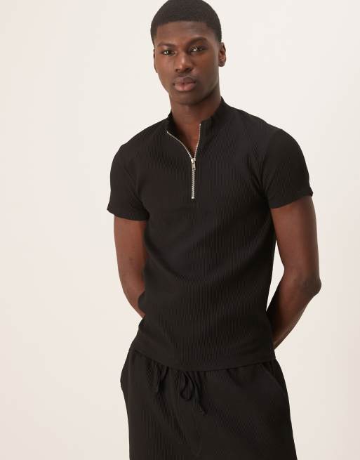 ASOS DESIGN – Kastiges, körperbetontes Plissee-T-Shirt in Schwarz mit Reißverschluss und Stehkragen, Kombiteil