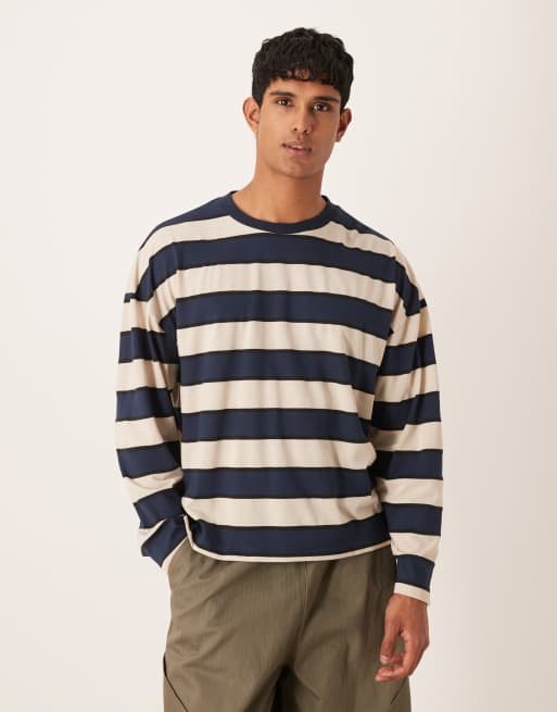 ASOS DESIGN – Kastiges, langärmliges Oversize-Shirt mit überschnittener Schulter und Streifenmuster in Blau und Braun