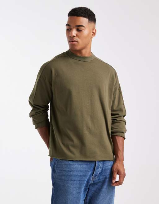 ASOS DESIGN – Kastiges, langärmliges Oversize-T-Shirt aus schwerem Stoff in Khaki mit tiefen Armlöchern