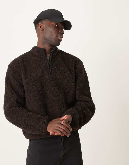ASOS DESIGN – Kastiges, locker geschnittenes Teddyfell-Sweatshirt in Braun mit kurzem Reißverschluss