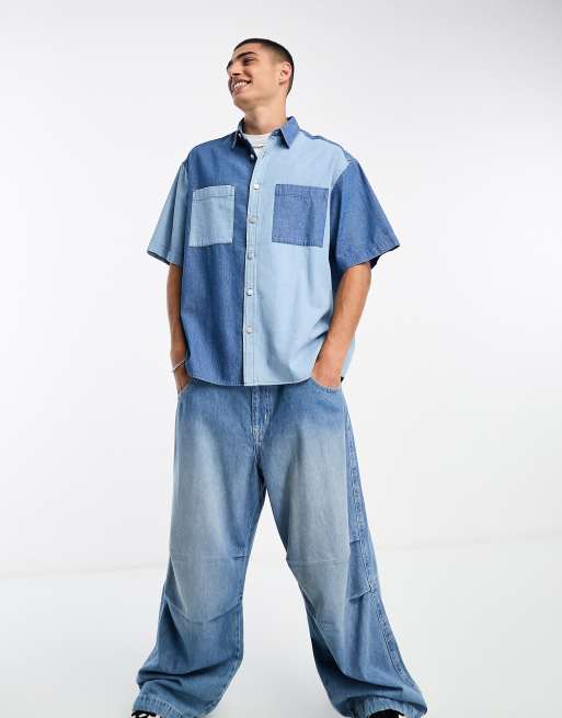 ASOS DESIGN – Kastiges Oversize-Jeanshemd in blauer Waschung mit Blockfarbendesign