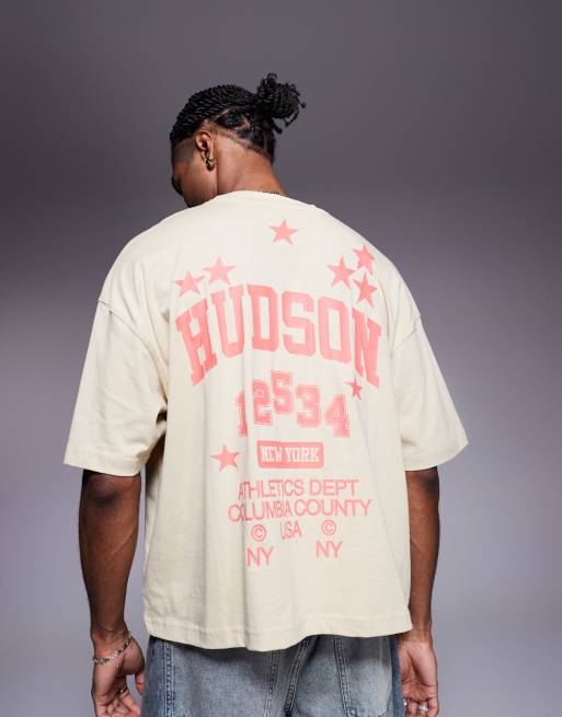 ASOS DESIGN – Kastiges Oversize-T-Shirt in Beige mit Sports-Grafikprint