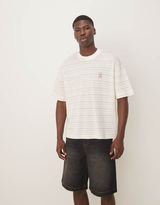 ASOS DESIGN – Kastiges Oversize-T-Shirt in Neutral mit Brust-Stickerei und strukturierten Streifen
