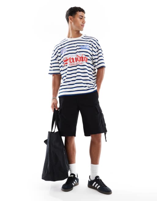 ASOS DESIGN – Kastiges Oversize-T-Shirt mit Rippstruktur-Streifen, überschnittenen Schultern und Sport-Grafikprints