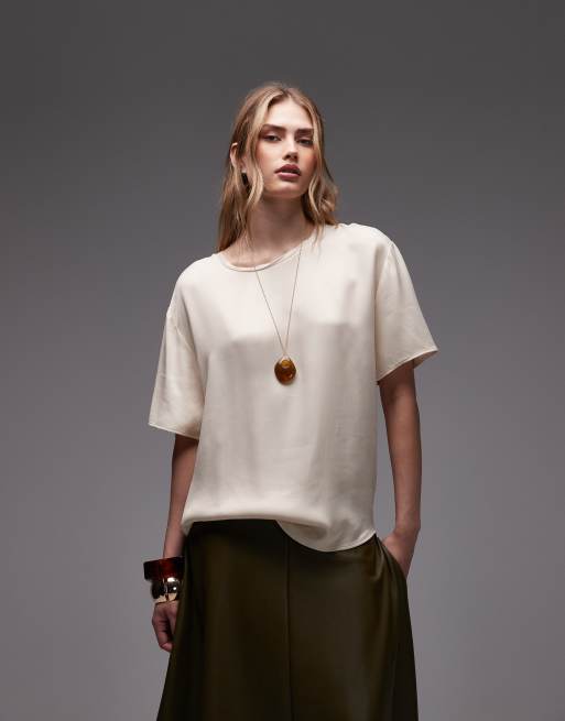ASOS DESIGN – Kastiges Satin-T-Shirt in Elfenbeinweiß mit Besatz aus Jersey