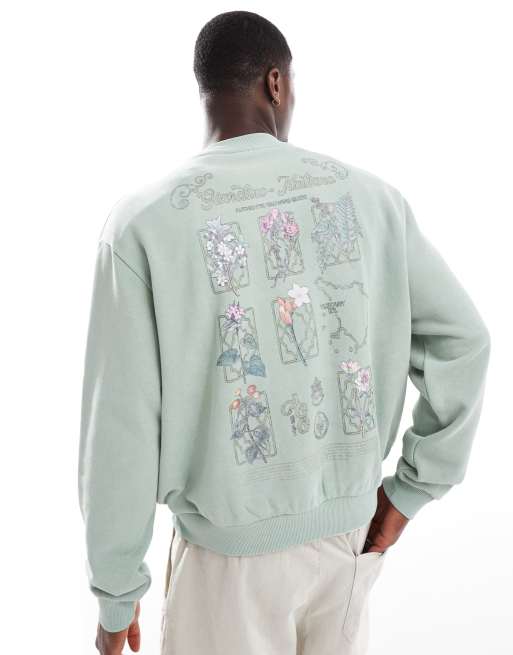 ASOS DESIGN – Kastiges Sweatshirt in verwaschenem Grün mit Blumen-Prints