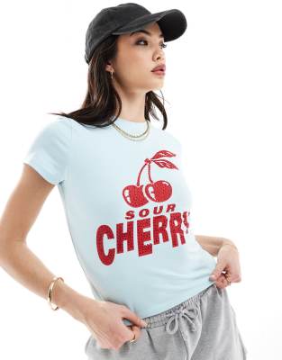 ASOS DESIGN – Knapp geschnittenes T-Shirt in Blau mit strassverziertem Kirsch-Grafikprint