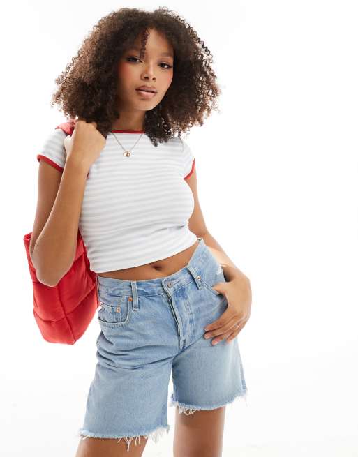 ASOS Design – Knapp geschnittenes T-Shirt in Blau mit Streifen und kontrastierendem Ringerdetail
