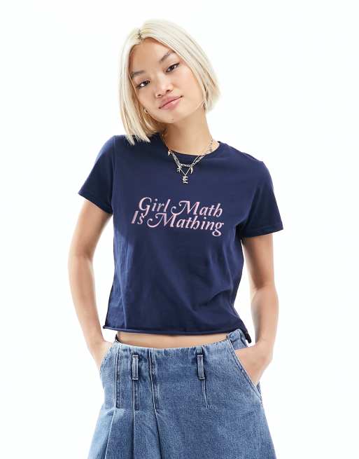 ASOS DESIGN – Knapp geschnittenes T-Shirt in Marineblau mit „Girl Math Is Mathing“-Grafikprint