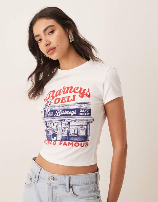 ASOS DESIGN – Knapp geschnittenes T-Shirt in Weiß mit „New York Deli“-Grafikprint