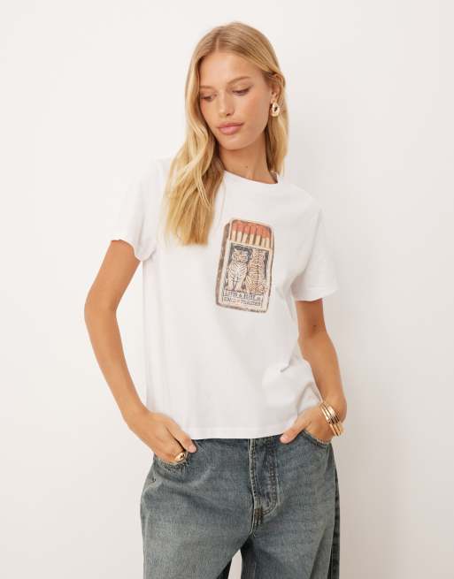 ASOS DESIGN – Knapp geschnittenes T-Shirt in Weiß mit Streichholzschachtel-Tigergrafik und lockerem Schnitt