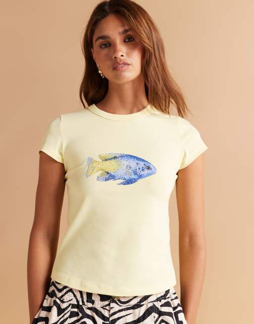 ASOS DESIGN – Knapp geschnittenes T-Shirt in Zitronengelb mit verzierter Fischgrafik