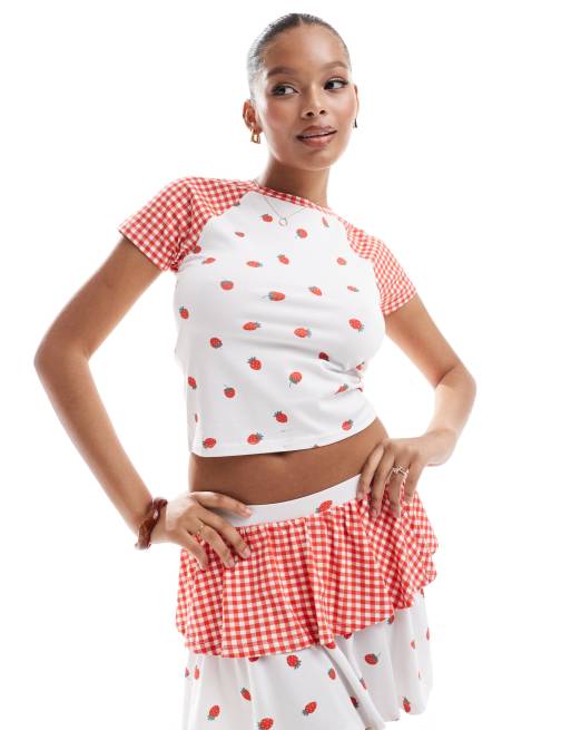 ASOS DESIGN – Knapp geschnittenes T-Shirt mit Raglanärmeln und Erdbeer-Print