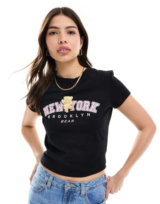 ASOS DESIGN – Knappes T-Shirt in Schwarz mit „New York Brooklyn“-Schriftzug und Bärengrafik