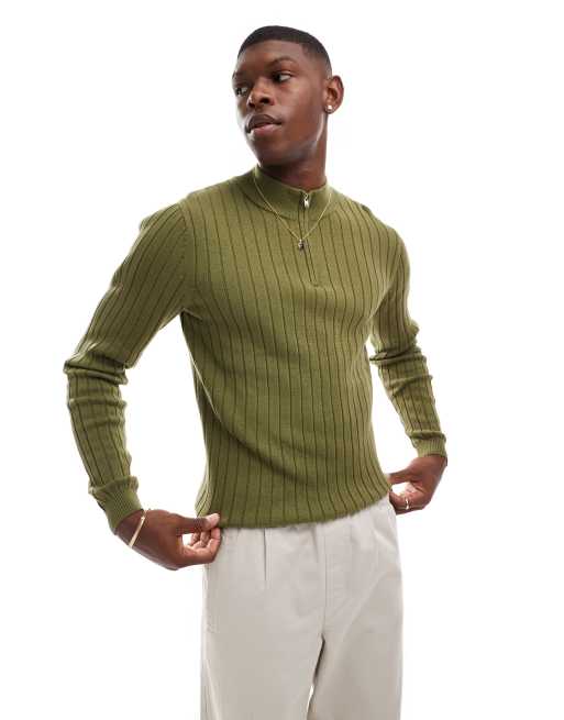 ASOS DESIGN – Körperbetonter Basic-Pullover aus Rippstrick in Khaki mit halblangem Reißverschluss