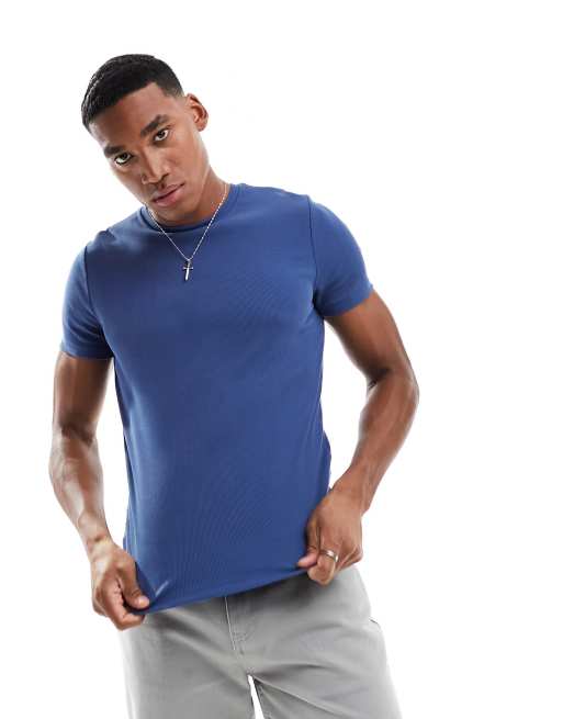 ASOS DESIGN – Körperbetontes, geripptes Basic-T-Shirt in Blau mit Rundhalsausschnitt
