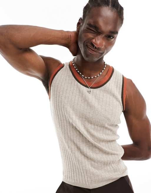 ASOS DESIGN – Körperbetontes Strick-Trägertop in Taupe mit kontrastierendem, geripptem Detail