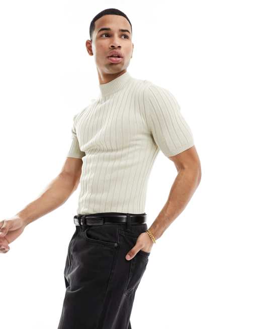 ASOS DESIGN – Körperbetontes T-Shirt aus leichtem Rippstrick in Steinbeige mit Stehkragen
