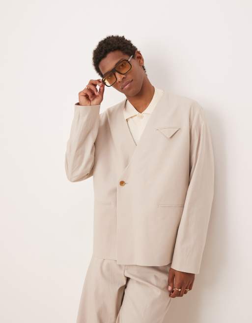 ASOS DESIGN – Kragenlose, kastige Anzugjacke in Steinbeige mit Leinenanteil